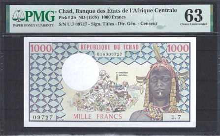 UNC biljet Chad 1.000 Francs 1978 P 3-d Updraded PMG 63