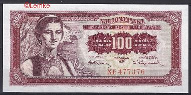 UNC biljet van 100 dinara 1955. Nummer kan verschillen.