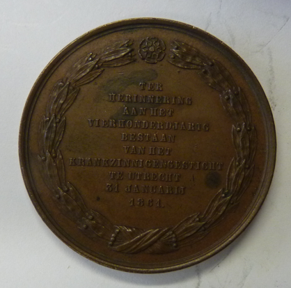 Bronzen herdenkingspenning ter herinnering aan het 400-jarig bestaan van het Krankzinnigengesticht te Utrecht, 31 januari 1861. Vz.: Tekst binnen gestikte lauwerkrans. Kz.: Vermelding van diverse regenten. Ø 41 mm