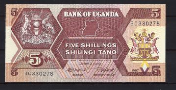Uganda 5 Shillings 1987 unc. nummer kan afwijken. P 27