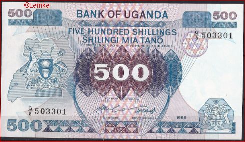 Uganda 500 Shillings 1986 unc. nummer kan afwijken. P 25