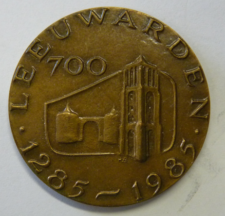Bronzen penning ter gelegenheid 700 jaar Leeuwarden, 1285-1985. Kz: Gestileerd wapen van Leeuwarden. Ø 39 mm