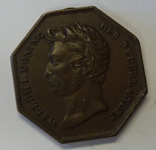 Bronzen achthoekige medaille van de Oorlog op Java 1825-1850. Vz.: Borstbeeld van Koning Willem I naar links. Kz.: Vierregelige tekst binnen lauwer- en palmtak. Zonder lint. Ø 29 mm