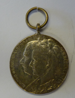 Zilveren geboortemedaille ter gelegenheid van de geboorte van Prinses Juliana in 1909. Vz.: Portretten van Koningin Wilhelmina en Prins Hendrik naar links. Kz.: Nederlandsche maagd bij de wieg van de jonggeborene, met naast haar de Nederlandsche Leeuw. Ø 25 mm