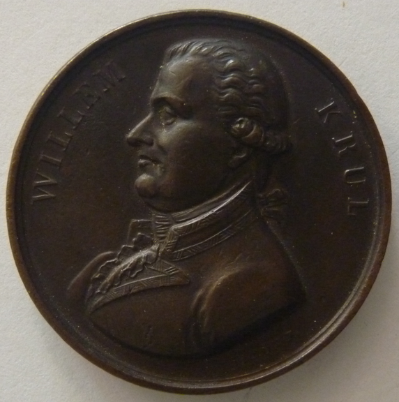 Bronzen penning ter herinnering van het overlijden van William Krul, 1781 door Jean Henri Simon. Vz.: Borstbeeld van William Krul, gesigneerd Siman.F. Kz.: Twee regels: Obitt-AN.MCCLXXXI. Geslagen tussen 1822 en 1826te Brussel. Ø 47 mm