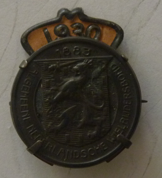 Bronzen insigne/speld van de ANWB 1930. Vz: Nederlands wapen met omschrift en jaartal 1883. Ø 30 mm