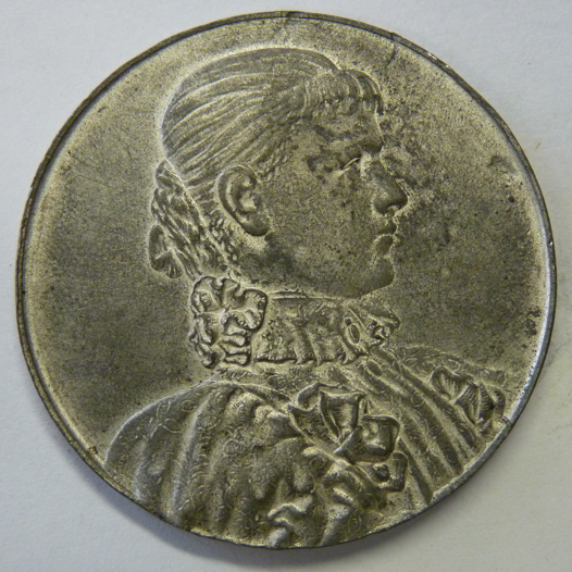 Aluminium penning van de Koninklijke Utrechtsche Fabriek van Zilverwerken C.J. Begeer. Kz.: Vrouwpersoon, gezicht naar rechts. Ø 46 mm