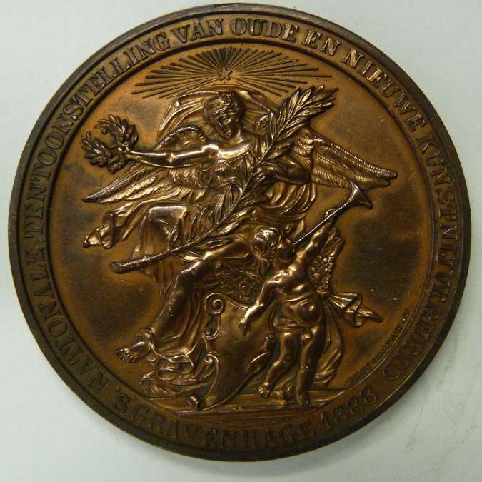 Bronzen prijsmedaille van de Nationale Tentoonstelling van Oude en Nieuwe Kunstnijverheid te Den Haag 1888. Ø 59 mm