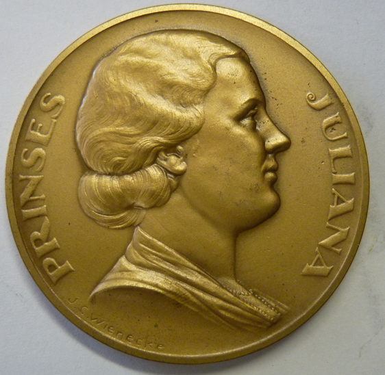 Messing erepenning Nationaal Crisis Comite met afbeelding Prinses Juliana. Aangeboden aan J.R. Snoeck Henkemans in dankbare herinnering medewerking nov. 31 – mei 36. Maker Joh. Corn. Wienecke. Ø 50 mm