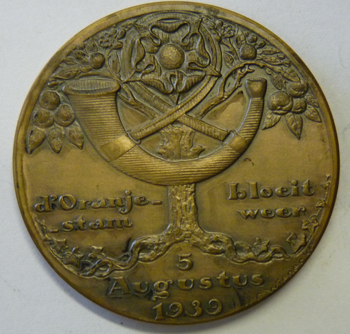 Messing penning Nationaal Fonds voor Byzondere Nooden, ter gelegenheid van de geboorte van Prinses Irene 5 augustus 1939. Kz: d’Oranjestam bloeit weer. Maker: J.C. Wienecke. Ø 45 mm