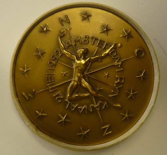 Bronzen gedenkpenning ter gelegenheid van de opening Amsterdam-Rijnkanaal op 21 mei 1952. Vz.: Gad van de Wind, Aeolus, omgeven door 4 windrichtingen en sterren. Kz.: Centraal staat een stuurwiel met het wapen van Amsterdam. Aan weerszijden staan de zee- en riviergod Neptunus en de God van de handel Mercurius. Ontwerp: Fred Carasso. In originele box van Koninklijke Begeer Voorschoten. Ø 60 mm