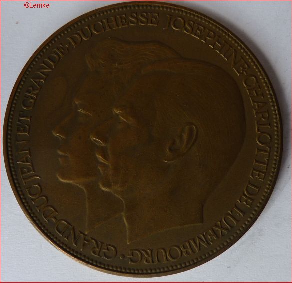 Bronze herinneringspenning visite Grand-duc Jean van Luxemburg aux Pays Bas in september 1967. Vz: Borstbeeld Grand-duc Jean et Grand-duchesse Josephine Charlotte de Luxembourg. Kz. Landswapen met omschrift. Ø 50 mm