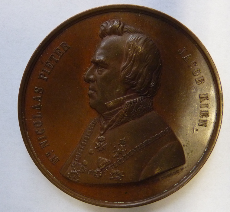 Herinningspenning 25 jaar burgemeesterschap Utrecht van Mr. Nic. Pieter Jacob Kien. Vz. Buste van Mr. Kien met omschrift. Kz. Tekst tussen eikenkrans. Brons. Ø 66 mm