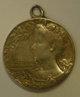 Zilveren penning ter gelegenheid van de inhuldiging van Koningin Wilhelmina op 6 september 1898. Vz.: Portret met diadeem en drieregelig opschrift. Kz.: Nederlandsche Leeuw voor de Nieuwe Kerk. Ontwerp: J.C. Wienecke. Ø 27 mm