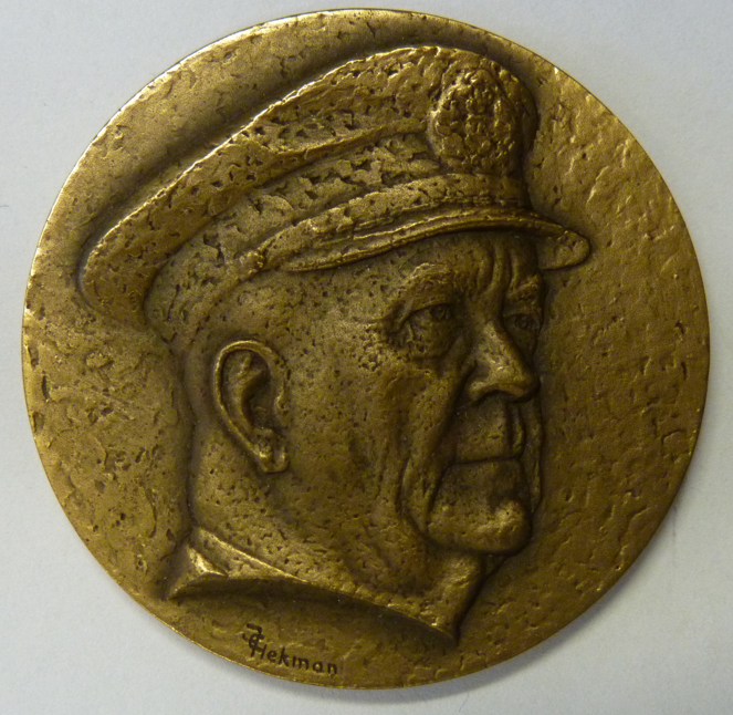 Bronzen herinneringspenning vanwege overlijden van Luitenant Admiraal C.E.L. Helfrich 1886-1962. Ontwerp: Joop Hekman (1921-2013). Ø 50 mm