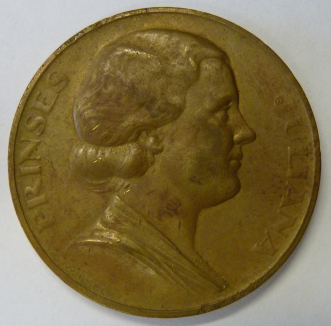 Bronzen beloningspenning van het Nationaal Crisis Comite met borstbeeld van Prinses Juliana 1936. Aangeboden aan J.H.P. Schrijnemaker. In Dankbaar Herinnering aan uw Medewerking nov. 1931 – mei 1936. Ontwerp: J.C. Wienecke. Ø 50 mm