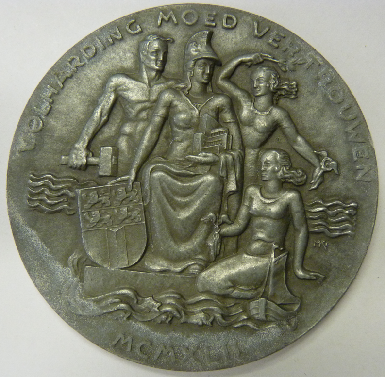 Zinken herdenkingspenning ter gelegenheid van de opening van de Maastunnel in 1942 by Marinus Kutterink Ø 71 mm