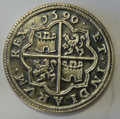 Replica van Spaanse 8 reales munt 1590. Vz.: Gekroond schild tussen aquaduct en waardeaanduiding. Phillippus D.G. Hispaniarum VIII. Kz.: Kastelen en leeuwen in de hoeken van een achthoek. Verzilverd koper. Ø 37 mm