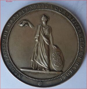 Zilveren herdenkingspenning ter gelegenheid van de Resolutie van Burgerlijke Onrust in Amsterdam 1696. Vz.: Neptunus op zeewegen, getrokken door twee paarden. Kz.: Stralende zon met vogelnest op voorgrond. Rol met zesregelige tekst erboven. Ø 37 mm