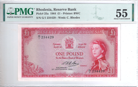 Mooi biljet Rhodesia 1 Dollar 1964 P 25-a Upgraded PMG 55