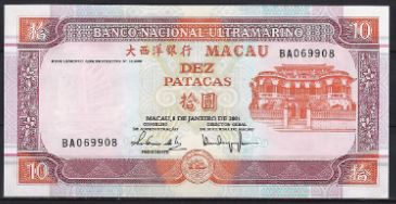Macao 10 Patacas 2001 unc. nummer kan afwijken