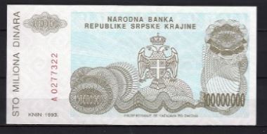 Mooi UNC biljet van 100.000.000 dinara 1993. Nr. R 25. Nummer kan afwijken.
