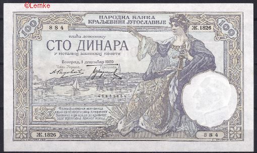 AUNC biljet van 100 dinara 1929. Nummer kan verschillen.