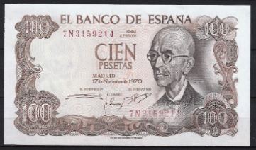 Spanje 100 Pesetas 1970 unc. nummer kan afwijken