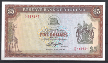 Mooi biljet Rhodesia 5 Dollars 1979 P 39-b aUNC
