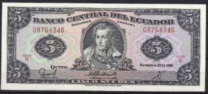 Mooi UNC biljet van 5 sucres 1988. Nummer kan afwijken. P 120A