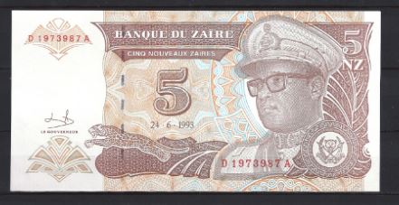 Mooi UNC biljet van 5 Nouveaux Zaires 1993. Nr. 53-a