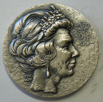 Zilveren penning ter gelegenheid van de 50ste verjaardag van koninging Beatrix 1988. Omschrift: “Beatrix Bataviae Regina 1988”. Ontwerp: Willem Verbon. Ø 38 mm