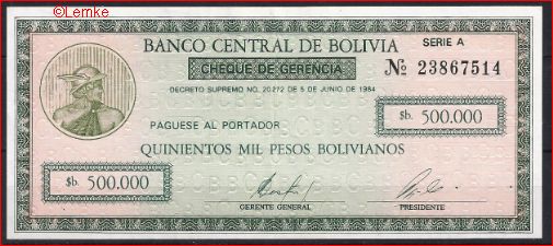 500.000 Pesos Bolivianos 5-6-1984 P 189 PR/XF
