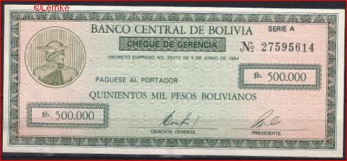 500.000 Pesos Bolivianos 5-6-1984 P 189 aUNC