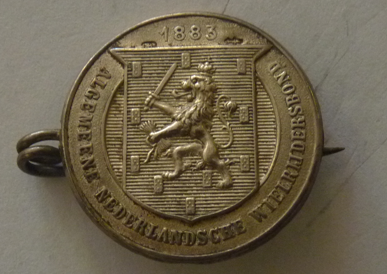 Broche/speld Algemene Nederlandsche Wielrijdersbond 1883. Nederlands wapen met omschrift. Ø 30 mm