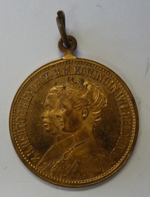 Bronzen draagpenning ter gelegenheid van het huwelijk van Koningin Wilhelmina en Prins Hendrik 1901.  Vz.: Tekst geslagen ter herinnering aan hun huwelijk 1901.  Kz.: Portretten van Kon. Wilhemina en Hendrik met omschrift.  Ø 28 mm