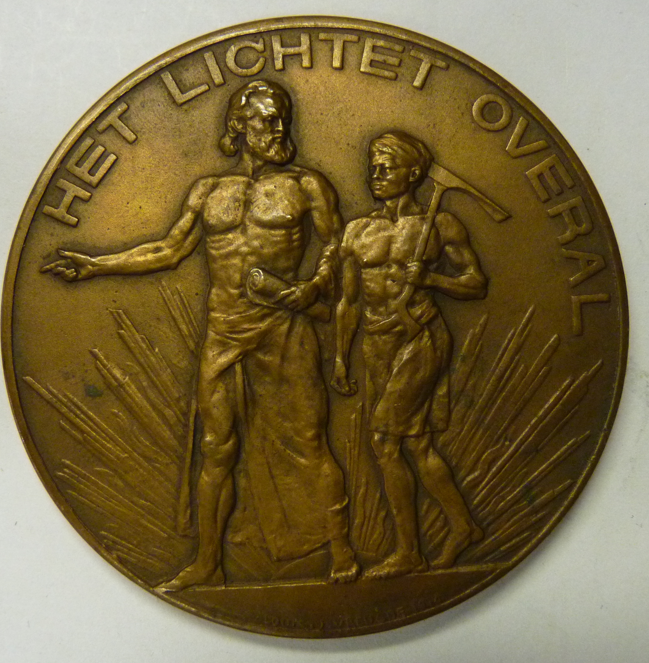 Bronzen erepenning van het Koloniaal Instituut, 1914. Vz. Bejaarde man met een schriftrol wijst een Javaan de weg. Omschrift “Het Lichtet Overal”. Kz. Een krans met Indische vruchten. Modele: Louis Vreugde. Ø 59 mm