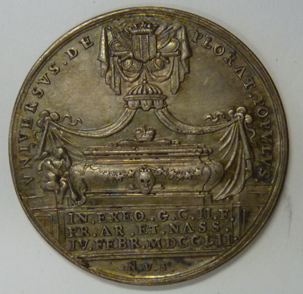 Zilveren herinneringspenning ter gelegenheid van de begrafenis van Stadhouder Willem IV te Delft 4 februari 1752.  Vz.: Graftombe onder baldekijn, waarboven krijgstrofeeen met gekroond wapenschild van Delft.  Kz.:  Begrafenisstoet op de Markt in Delft.  Oplage 936 stuks, uitgereikt aan de leden van de Delftse Schutterij.  Door N. van Swinderen.   Ø 37 mm