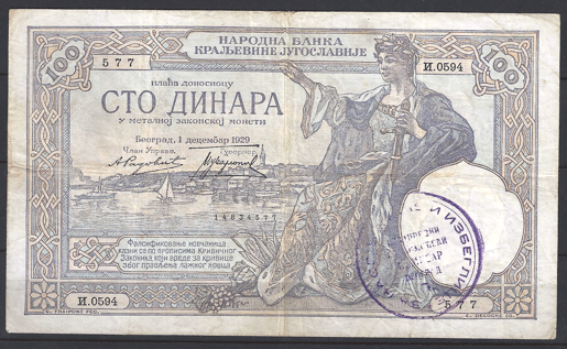 100 dinara P31a 1934/1941 fine biljet voor vluchtelingen hulp