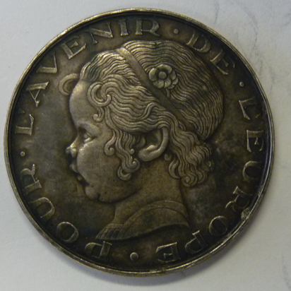 Silver plated coin aligment, La Circularion Diminue Le Chomage 1/20 FL. Pour L’Avenir de L’Europe.  Geslagen door Koninklijke Begeer BV.  Ø 34,8 mm