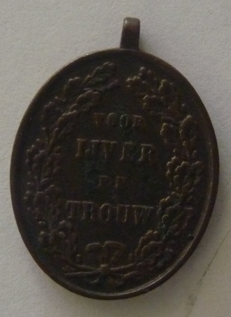 Bronzen medaille voor Ijver en Trouw (ingesteld sinds 1877) als beloning voor langdurige, ijverige en trouwe diensten van militaire werklieden, laere ambtenaren en bedienden, werkzaam bij Rijks Zee- en Landmacht. 31×26 mm