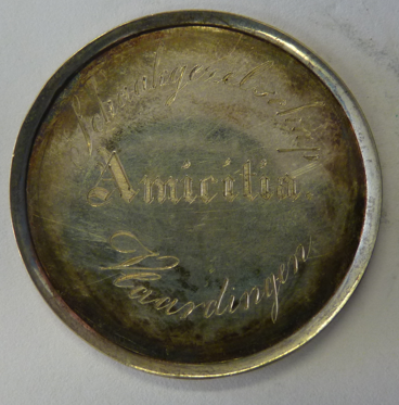 Zilveren prijsmedaille uitgegeven door schaakgezelschap “Amicitia” te Vlaardingen 1859. Afgegeven als 1e prijs aan C. Spruijt 1859. Ø 39 mm