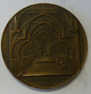 Bronze medal ter gelegenheid vande American Bar Association aan London 1924 als gasten van de Engelse advocaten.  Vz.: Westminster Hall, gezien van de ingang.  Kz.: Negenregelige tekst omringd door een krans.  Ø 38 mm