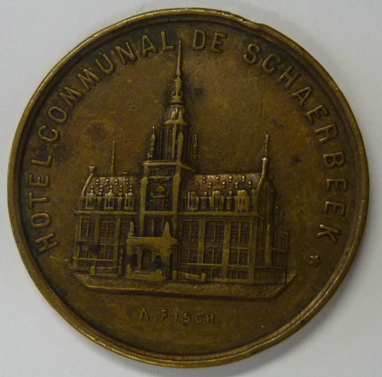 Bronze medal Belgium 1887, ter gelegenheid van de Unauguration City Hall Schaerbeek 21 juli 1887. Vz.: City Hall of Schaerbeek. Kz.: tekst “Inauguration 21 julliet 1887”. Ø 32,5 mm
