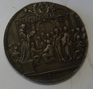 Zilveren herinneringsmedaille ter gelegenheid van de kroning van Willem III van Oranje tot koning van Great Britain. Vz.: Zicht op Roterodamum. Kz.: Standbeeld van Erasmus van Rotterdam naast de snaatsvergadering in de balzaal. Ø 30 mm
