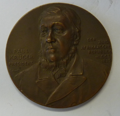 Bronzen medal ter ere van Paul Kruger, President der Zuid Afrikaansche Republiek 10 october 1825.  Vz.: Borstbeeld van Paul Kruger.  Kz.: Boomtakken verstrengeld en tekst: “Aan de dappere strijders voor recht en vrijheid 1899-1900”. By A. Scharff.  Ø 39,5 mm