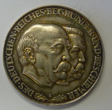 Zilveren medal Germany 1930 met Paul von Hindenburg und Furst Otto von Bismarck. Vz.: Portretten van beide heren en omschrift: Des Deutchen Reiches Begrunder und Beschirmer. Kz.: achtregelige tekst binnen een rand van umlaufende wappens. Ø 36 mm