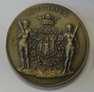 Zilveren penning Belgium 1960, ter gelegenheidviering 10-jaar EGMP te Antwerpen 1950-1960. Vz.: Het gekroonde wapenschild van de stad Antwerpen, vastgehouden door een wildeman en wilde vrouw met knots. Kz.: Tekst en omschrift op een glad veld. Ø 32 mm