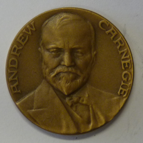 Bronzen historiepenning met portret van Andrew Carnegie en de opening van het Vredespaleis in Den Haag 1913. Carnegie speelde een belangrijke rol bij de oprichting van het Vredespaleis. Ø 29 mm