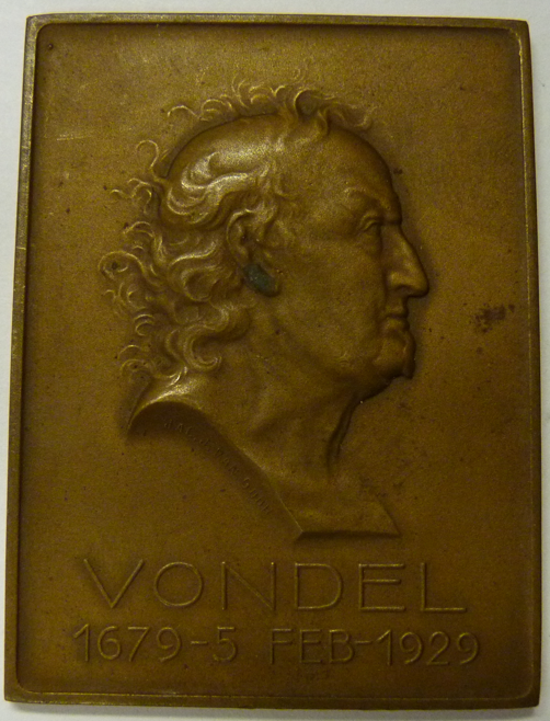 Bronzen herdenkingsplaquette aan Joost van den Vondel 1679-1929 door J.J. van Goor. 45 x 60 mm